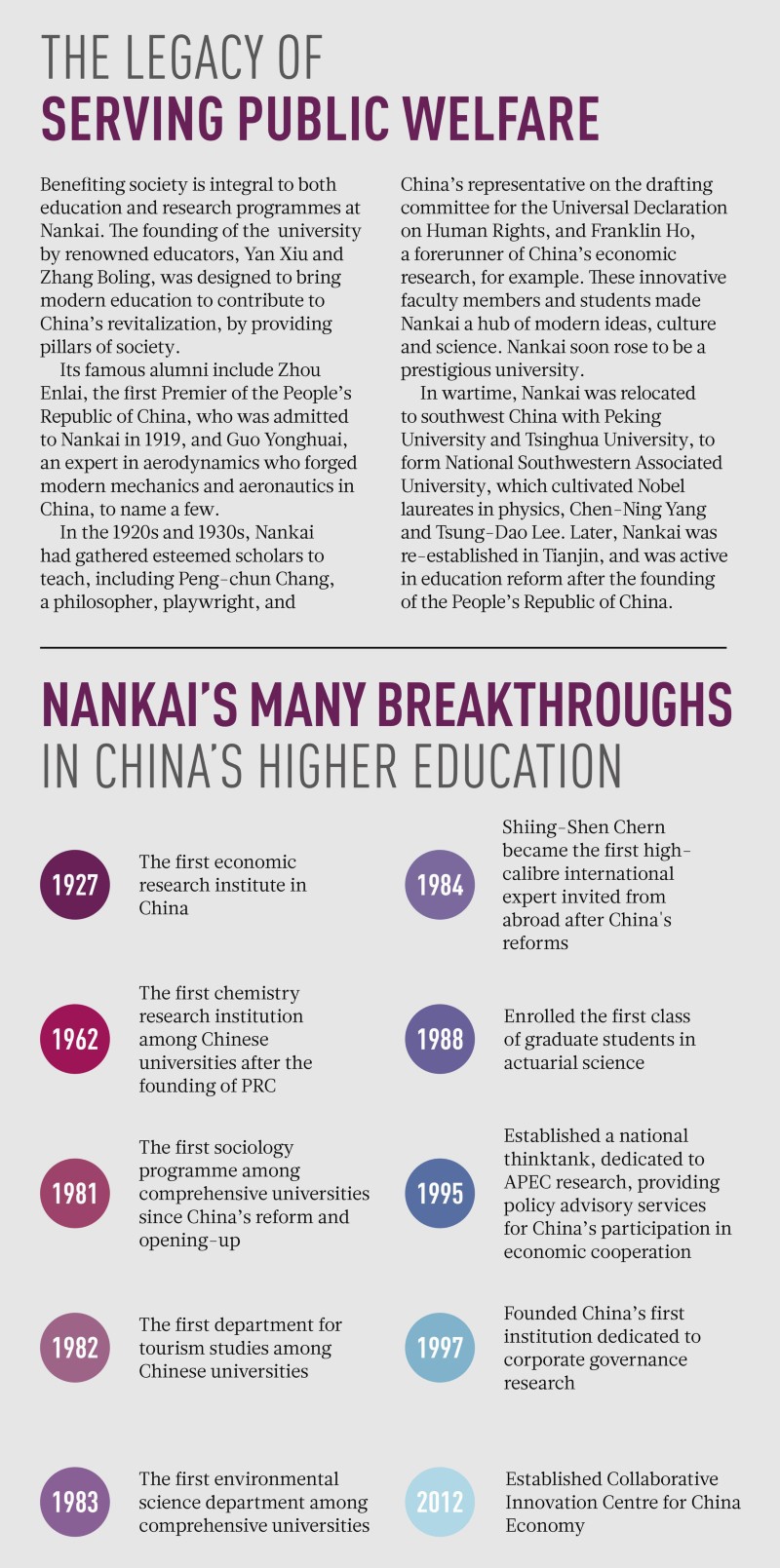 Since its founding in 1919, Nankai University has forged a strong academic reputation. Known as the ‘North Star’ among China’s higher education institutions, it has gathered many academic leaders over the years, and inspired generations of students, building a model for higher education in China. Aimed at making an impact on society, the university has produced many results that have brought significant socioeconomic benefits.